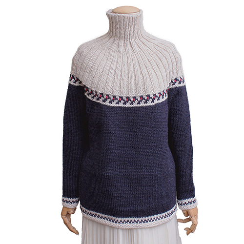 ヨークからネックへと続くリブ編みラインにフォークロア調の
