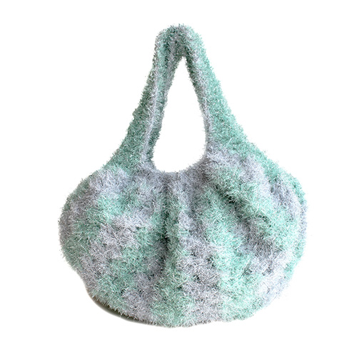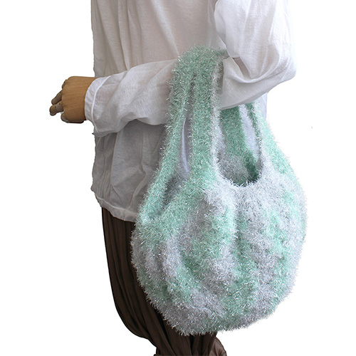 2色をかぎ針編みで縞に四角く編み、周りはギャザーを寄せて縁や持ち手を作ります。
