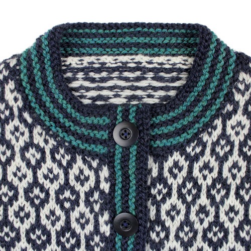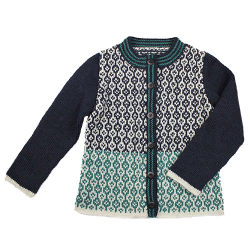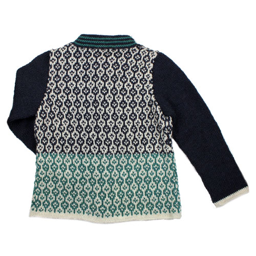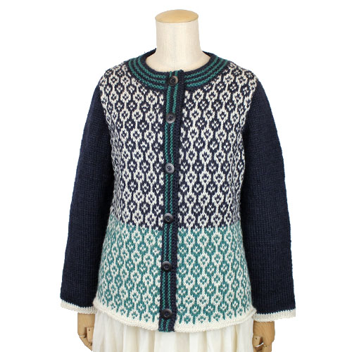 トラディショナルな編み込み模様のカーディガンです。裾のグリーンがとてもフレッシュな印象です。