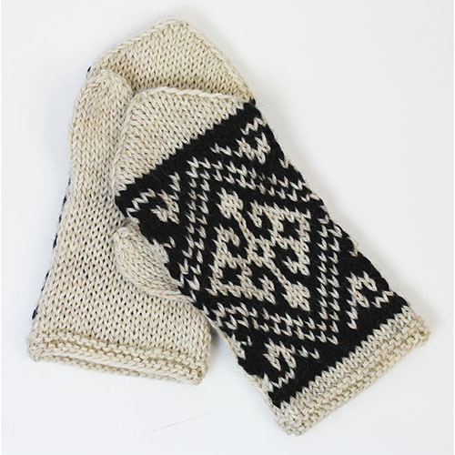 ヨーロッパの紋章からインスピレーションを得て編んだミトンは、ベーシックな配色により素朴でクラシカルな印象に。 コートの袖口からのぞく存在感のある手元に。