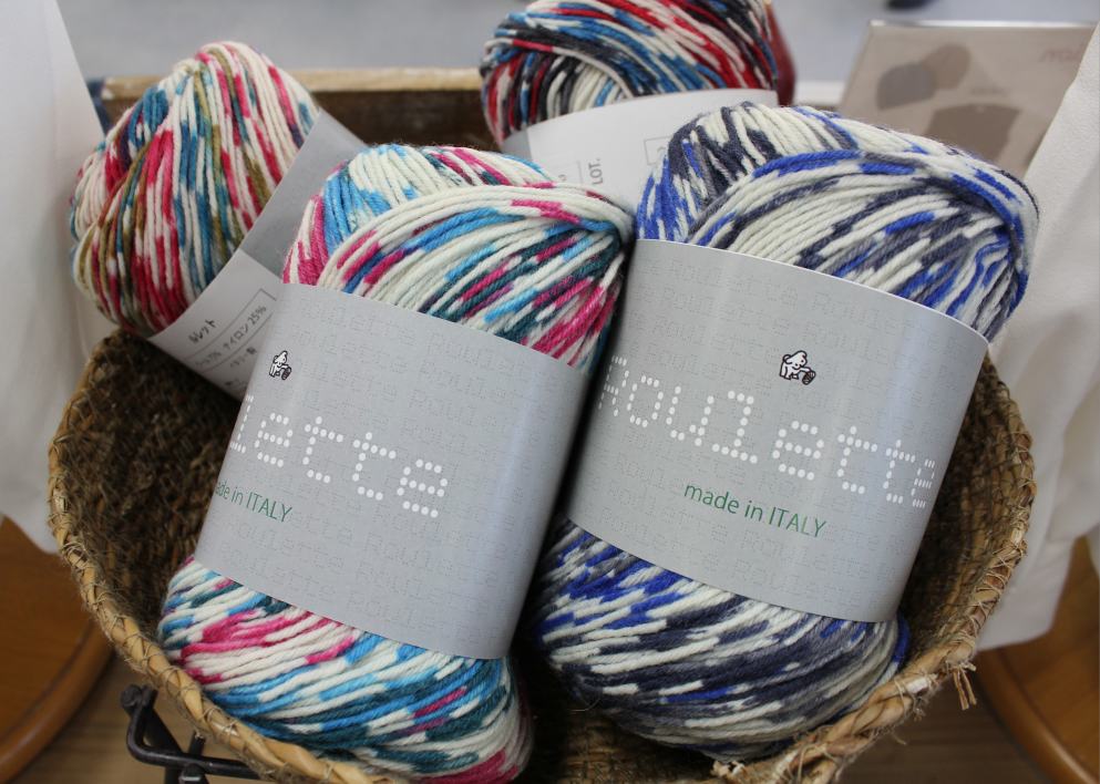 | 『ルレット』 ウール75% ナイロン25% 100g/260m 合太 全6色展開 価格3,080円(2,800円+税) 手芸道具の「ルレット」を意味するその名は 点々とリズムよく現れる模様から 名付けられました 編み込んだ様に見える 愉快な編地は 適度な弾力があり ウエア・小物共にお楽しみいただけます |